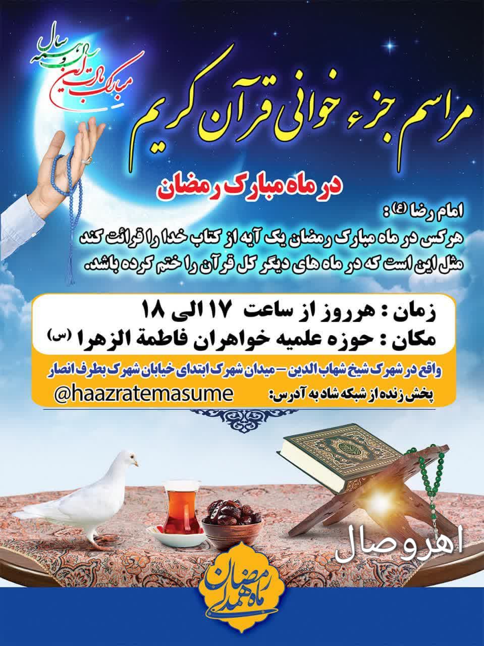 به گزارش پایگاه خبری #اهروصال، جزء خوانی قرآن کریم در ایام ماه مبارک رمضان هر روز از ساعت ۱۷ الی ۱۸ با حضور قاریان در حوزه علمیه خواهران فاطمه الزهرا علیها السلام شهرستان اهر تا آخر این ماه مبارک در حال برگزاری است.