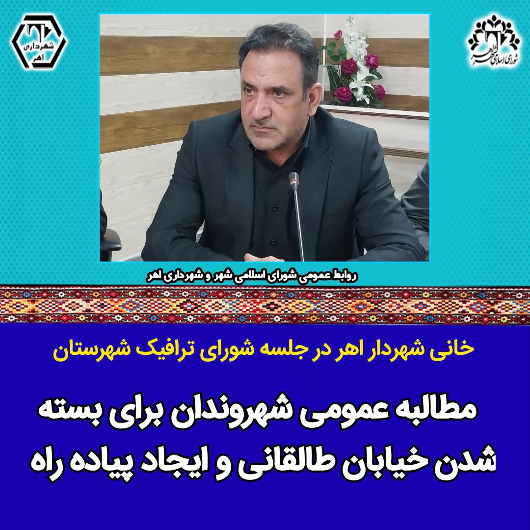 وی با اشاره به اجرای پروژه پیادهراه خیابان طالقانی اظهار داشت: ما صرفا به این پروژه به عنوان یک پیادهراه نگاه نمیکنیم بلکه این طرح در آینده می تواند به عنوان یک گذر فرهنگی در شهر اهر باشد تندیس ها و سردیس های مشاهیر و مفاخر توسط هنرمندان اهری در آن نصب شده و زمینه برند شدن آن در کنار عمارت تاریخی شهرداری تا زمینه ثبت جهانی آن فراهم شود چون یکی از قدیمیترین شهرداری های کشور است و میتواند ثبت ملی آن در کنار ثبت جهانی بقعه شیخ شهاب الدین اهری و ایجاد یک گذر فرهنگی می تواند هویت تاریخی شهر اهر را حفظ کرده و با همکاری فرمانداری، مجموعه راهنمایی و رانندگی نیروی انتظامی شهرستان اهر و بازاریان و شهروندان عزیز این شهر را به مکان واقعی آن برساند. روابط عمومی شورای اسلامی شهر و شهرداری اهر