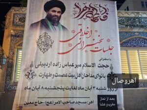 سلسله جلسات اخلاقی با سخنرانی حجت الاسلام میرعباس زاده اردبیلی و با نوای مداحان اهل بیت عصمت و طهارت هر شب تا پنجشنبه ۸ آبان در محل مسجد حاج معین شهرستان اهر در حال برگزاری می باشد.